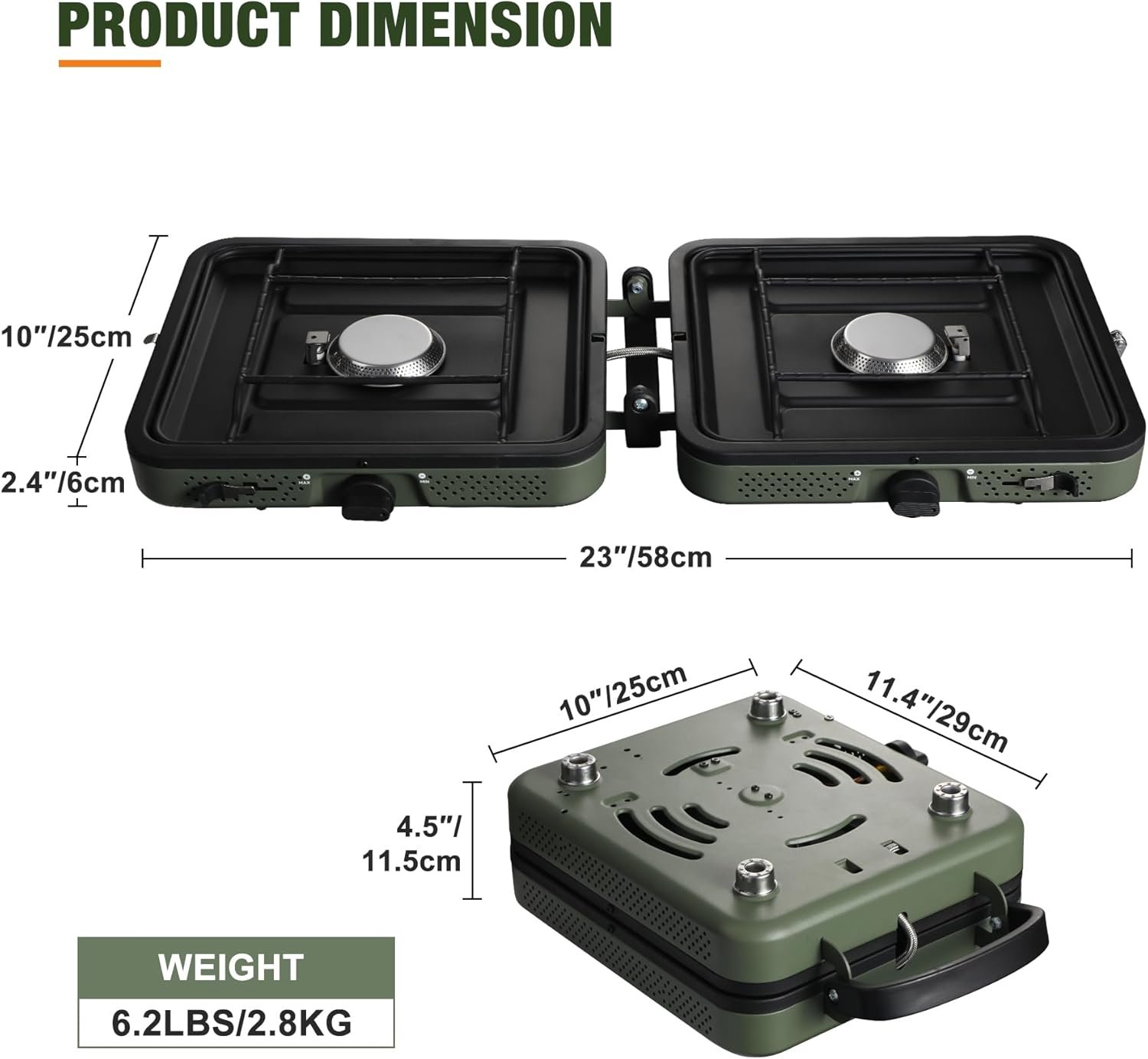 - Dual Burner Design: Our Camping Stove features a dual burner setup, allowing you to cook 2 pans or pots with a diameter of up to 10” simultaneously, maximizing efficiency and saving you valuable time on outdoor adventures