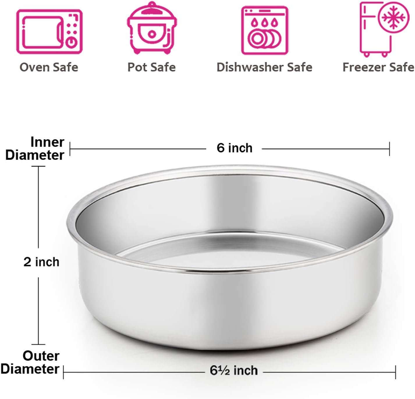 This 6-inch cake pan set includes 3 stainless steel round cake pans made of non-toxic, healthy materials. The mirror-polished finish makes them dishwasher safe, convenient, and practical, suitable for making various cakes and desserts. An ideal choice for baking enthusiasts. This product is a standard household kitchen item and does not contain any patented designs.